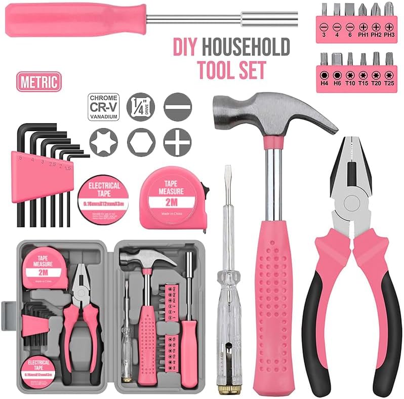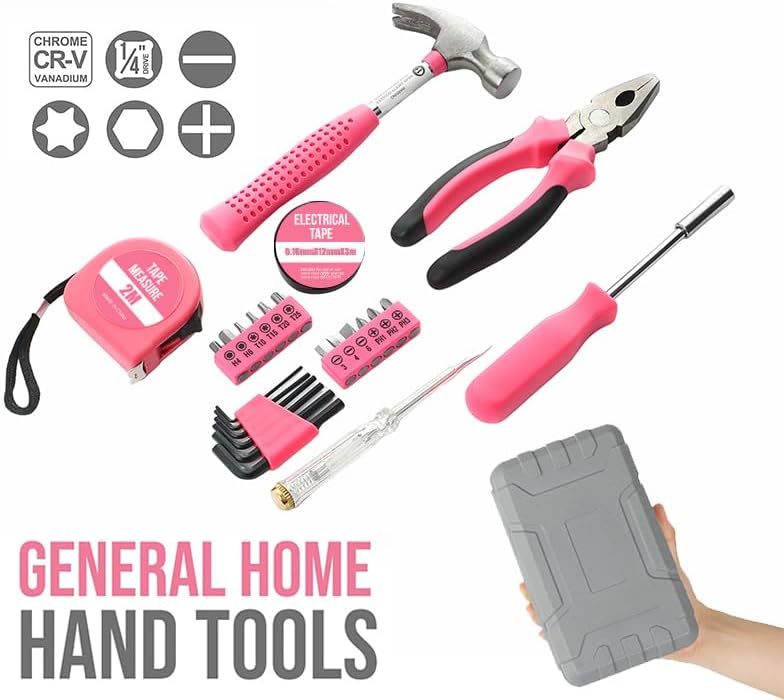 DO IT HERSELF TOOLKIT: Take care of your living space by using this comprehensive collection of durable steel hand tools including a compact hammer, featuring non-slip handles for comfortable grip and precision during screwdriving, hammering, installation, and assembly tasks